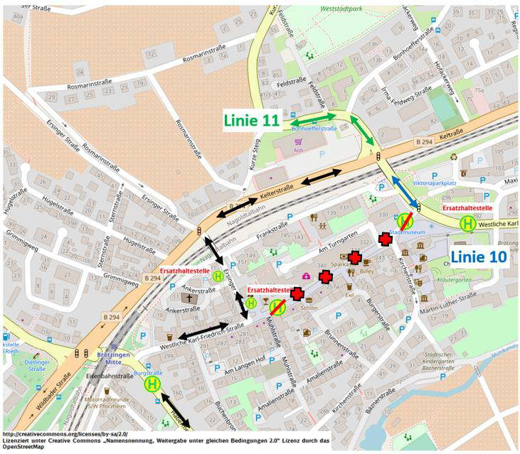 Fahrgäste der Linie 10 nutzen bitte die Ersatzhaltestellen in der Westlichen-Karl-Friedrich-Straße bei der Viktoriabrücke (Bücherbushaltestelle) oder die Ersatzhaltestellen in der Ersinger Straße. Fahrgäste der Linie 11 nutzen bitte die Haltestelle „Bonhoefferstraße“ oder die Ersatzhaltestellen in der Ersinger Straße.