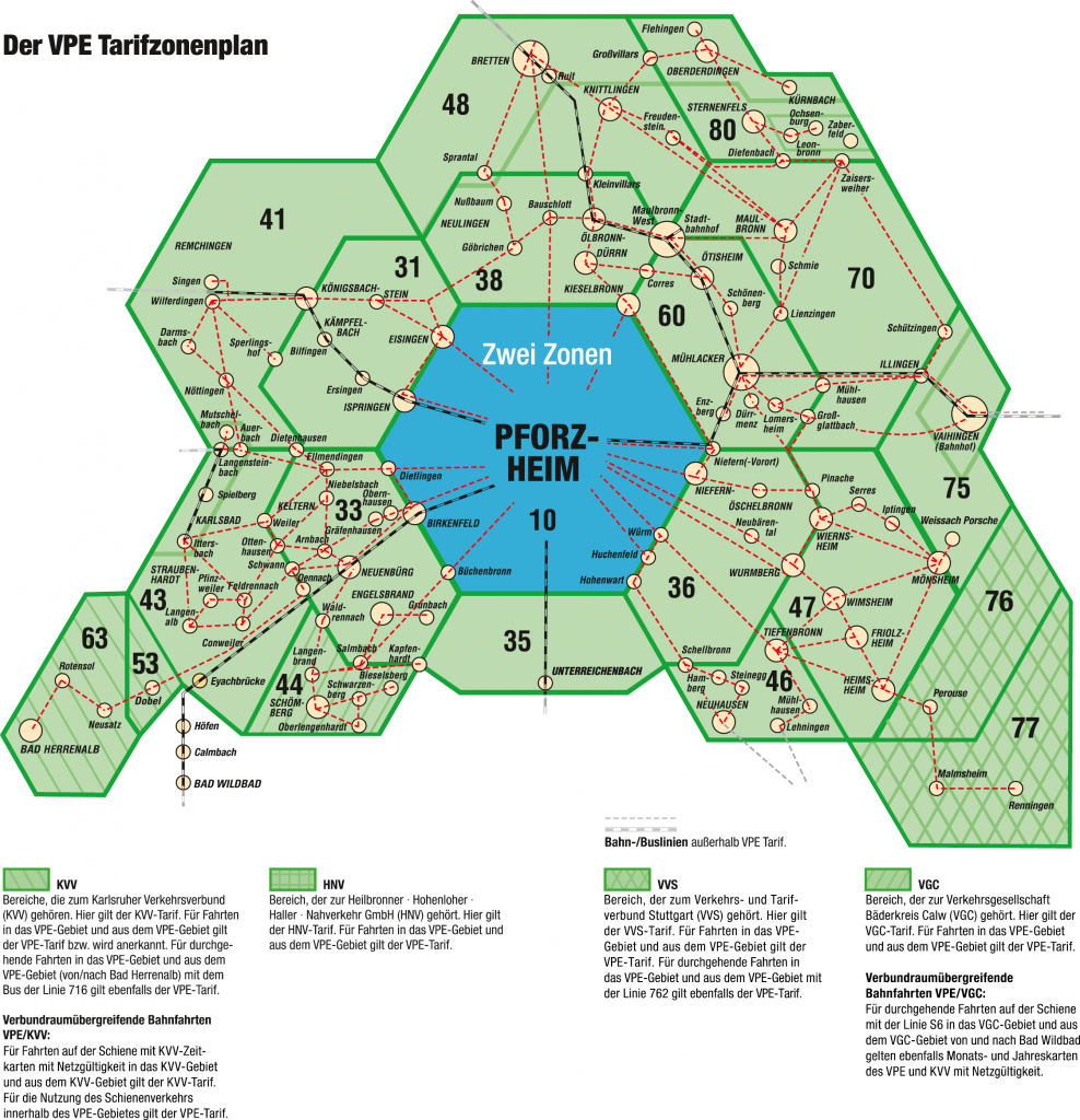 Die Fahrpreisermittling im Verkehrsverbund Pforzheim-Enzkreis ist ganz einfach: Ausschlaggebend für den Fahrpreis ist die Anzahl der befahrenen Tarifzonen. Start- und Zielzonen zählen mit. Wenn eine Fahrt an einem Ort beginnt, der auf einer Zonengrenze liegt, dann zählt diese Haltestelle zu der Zone, in der die Fahrt weitergeführt wird. Endet die Fahrt an einer Haltestelle auf der Zonengrenze, so zählt diese zu der Zone, aus der die Fahrt kommt.