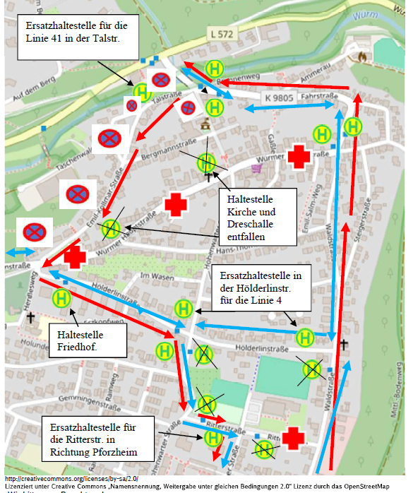 Auf der Linie 4 entfallen die Haltestellen „Würm Hölderlinstraße und „Wüem Hohenwarter Straße“. Für die Haltestelle „Würm Hölderlinstraße“ ist in der Hölderlinstraße eine Ersatzhaltestelle eingerichtet. In Richtung Pforzheim entfällt die Haltestelle „Würm Ritterstraße“. es ist eine Ersatzhaltestelle eingerichtet.